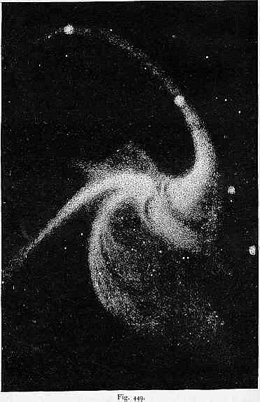 В 1911 году Эммануил Пален исследовал два самых ярких спиральных рукава галактики и обнаружил, что их форма описывается логарифмическими спиралями с разными углами закрутки. В 1915 году Фрэнсис Пиз измерил лучевую скорость галактики по её спектру и получил значение в −278 км/с, а в следующем году он же обнаружил различие в скорости ядра и одной из эмиссионных туманностей, благодаря чему сделал вывод о вращении галактики[67].