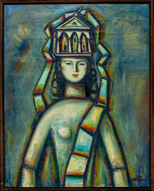 Композиция картины выполнена в вертикальном формате. В ней представлен поясный план женской фигуры, стилизованной под статую. Головной убор фигуры воспроизведён в виде здания в классицистическом стиле, дополненного ниспадающей зигзагообразной лентой.