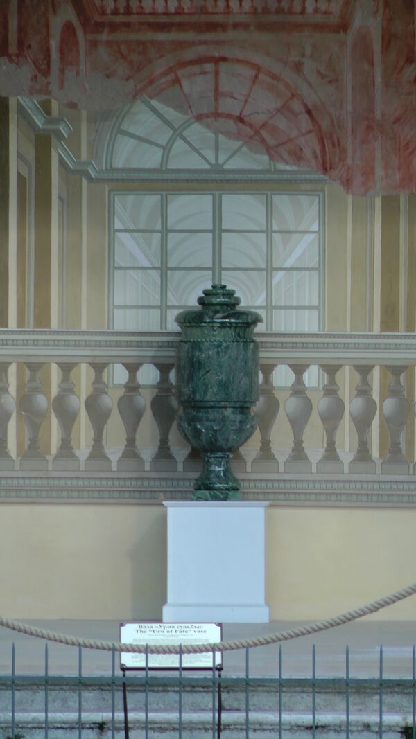 Здесь же, в Галерее, временно находится декоративная ваза из устьянской яшмы «Урна Судьбы». Она была выполнена на Колыванском камнерезном заводе (Алтай) в 1787 году именно для Павловска, но располагалась изначально в так называемой Семейной роще[22]. Во время Гражданской войны ваза была разбита, а рощу, которая её окружала, вырубили на дрова. Считается, что запасы устьянской яшмы к настоящему времени выработаны полностью. Ваза обошлась Павлу I в две с половиной тысячи рублей золотом. Мастера не сумели вырезать полутонную вазу целым куском, поэтому в столицу отправили семь фрагментов с туманными названиями: «плинт», «навершие», «тулово», «жемчужница». Так как чертежи затерялись в дороге, то в Павловске «Урну Судьбы» собрали неправильно, неверно истолковав названия фрагментов. Это поняли реставраторы, когда попытались воссоздать разбитую вазу. Реставрация проводилась на Колыванском заводе, где заново вырезали четыре утраченные части. Камень был взят из Ревневского месторождения, рисунок на нём отличается от оригинала, но оттенок на него похож[23]. Принято считать, что берёзовая Семейная роща и стоящая в ней «Урна Судьбы» упомянуты в элегии Василия Жуковского «Славянка» (1815).