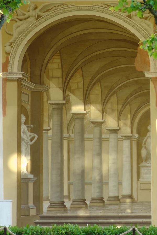 В. Курбатов писал, что между колоннами галереи стояли статуи четырёх времён года итальянской работы XVIII века. В самой галерее находилась бронзовая группа работы Михаила Козловского, изображавшая Геркулеса, скачущего на коне. Она была выполнена в 1799 году и вызвала восхищение современников (воспета даже в стихах)[17]. Деревья в садике около галереи были подстрижены, а между ними расставлены бюсты и довольно грубая, но курьёзная копия «Полины Боргезе» Антонио Кановы. Фресками покрыты не только стены в глубине галереи, но и прилегающий угол между галерей и дворцом. Стволы подстриженных деревьев и колонны галереи производят впечатление единого архитектурного сооружения. Фрески на наружной стене, находящиеся под дождём и ветром, сохранились к началу XX века достаточно хорошо[19]. До 1917 года в галерею из парка на зиму свозили кадки с тропическими деревьями. Здесь растения погружались в зимнюю спячку, а с наружной стороны галереи задёргивались шторы, чтобы предотвратить их гибель[5].