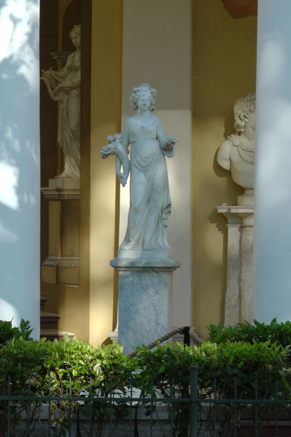 Искусство Гонзаго наполнено весельем и радостью. Художник, яркий представитель классицизма, свои идеалы видел в античности, хотя в его работах ощутимо влияние романтизма. Галерею Гонзаго и прилегающую к ней территорию украшала мраморная и бронзовая скульптура. В Галерее между сдвоенными колоннами находятся три подлинные итальянские статуи XVIII века: «Зима», «Весна» и «Осень». Статуя «Лето» до нашего времени не сохранилась. Статуя «Церера», заменившая её в сейчас, близка по теме, но выпадает из ансамбля из-за несколько больших размеров. В глубине, у самой стены, находятся работы итальянских скульпторов XVIII века — бюсты Аполлона (I половина XIX века, копия с оригинала скульптора IV века до н. э. Леохара[21]) и весталки на подлинных мраморных резных постаментах[22].