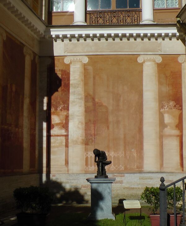 На небольшой лужайке перед Галереей находилась бронзовая скульптура летящего Меркурия, отлитая в Императорской Академии художеств в 1783 году мастерами Эдмом Гастеклу и Василием Можаловым с восковой модели Фёдора Гордеева по оригиналу итальянского скульптора фламандского происхождения XVI века Джованни Болонья. Она также пропала во время войны. Скульптура была найдена в музее города Граца и возвращена правительством Австрии. Ныне статуя установлена на историческое место[22]. На площадке между северным фасадом центрального корпуса и стеной Галереи в XIX веке находилась бронзовая скульптура «Мальчик, вынимающий занозу» (Россия, XVIII век с античного оригинала I века н. э.). Она пропала в годы оккупации (её закопали перед приходом немецких войск, но обнаружить уже не смогли; она числится похищенной), и сейчас заменена статуей итальянской работы II половины XIX века (скульптор М. Амодио) на эту же тему (инвентарный номер 11-202, её музей купил в 2008 году, установлена в 2014 году)[22].