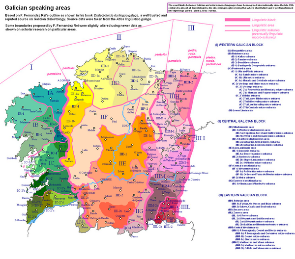 В галисийском языке выделяют три группы диалектов, каждая из которых имеет свои особенности. Западный диалект распространён в районе Риас-Бахас (галис. Rías Baixas, исп. Rías Bajas), вплоть до Сантьяго-де-Компостела. Центральный диалект занимает бо́льшую часть территории Галисии, а восточный диалект распространён на крайнем востоке Галисии и в приграничных зонах Леона и Саморы. Основными отличиями этих диалектов являются gheada и seseo.
