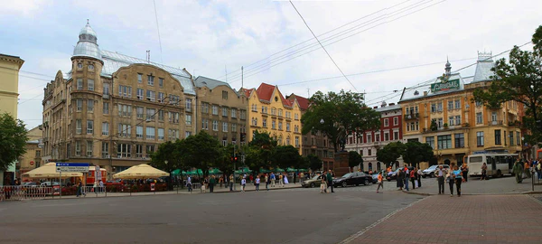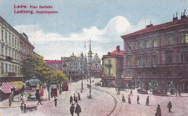 Уже в 1880 г. через Галицкую площадь пролегла линия конного трамвая к Мытной площади и далее Лычаковской улице. В 1894 г. По площади пустили также линию электрического трамвая, по ул. Батория (ныне улица Князя Романа) к Галицкой краевой выставке. В 1909 г. электрический трамвай стал двигаться через Бернардинскую площадь (ныне — Соборную). В 1951 г. были ликвидированы трамвайные линии на Первомайской улице (нынешнем проспекте Свободы) и части Галицкой площади, a в начале XXI века трамвайные пути разобрали здесь полностью.