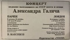 25 июня 1974 года Александр Галич уезжает из СССР по израильской визе, но на пересадке в Вене получает в норвежском посольстве нансеновский паспорт (удостоверение беженца) и вместо Израиля отправляется в Норвегию, заехав по пути во Франкфурт на конференцию журнала «Посев»[53]. На родине имя Галича вымарывается из титров кинофильмов, все тексты его сценариев и пьес изымаются из библиотек и оказываются под запретом[54].