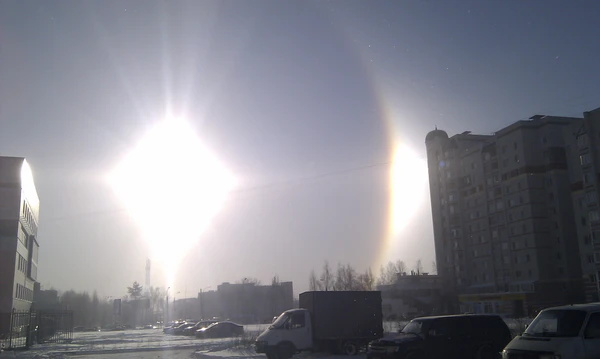Стояло солнце в круге, а по середине круга крест, а по середине креста солнце, а вне круга по обе стороны два солнца, а над солнцем вне круга дуга рогами на север; такое же знамение было и в луне, такого же точно вида, в течение трёх дней 4, 5 и 6 февраля, днём в солнце, а ночью в луне, три ночи nодряд[9].