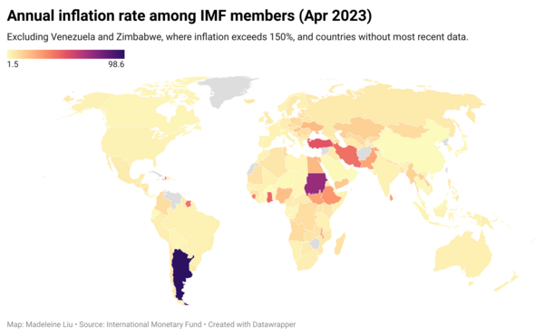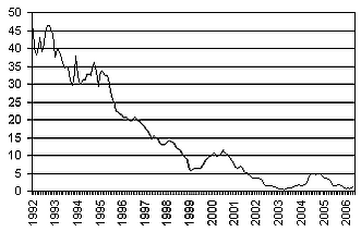 - Россия — 1991, c 1995 года, сменив гиперинфляцию (1992—1994). По мнению некоторых аналитиков и представителей оппозиционных партий, современная инфляция в России продолжает оставаться галопирующей[7][8][9], но это отрицается высшим руководством страны.[10]