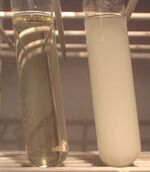 Когда в качестве реагентов используются йод и гидроксид натрия, при положительной реакции образуется иодоформ. Йодоформ (CHI3) — светло-желтое вещество, твердое при комнатной температуре, в отличие от хлороформа и бромоформа. Он нерастворим в воде и обладает антисептическими свойствами . Видимый осадок этого соединения будет образовываться только в присутствии метилкетонов, уксусного альдегида, этанола или подходящего вторичного спирта.