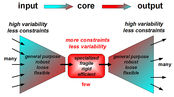 Согласно Чете и Дойлу[1], галстуки-бабочки способны оптимально организовывать потоки массы, энергии, сигналов в общую структуру, которая вынуждена иметь дело с сильно изменчивой и «грязной» средой. С биологической точки зрения галстук-бабочка управляет большим веером стимулов (вход), она включает «сжатое» ядро и выражает большой веер из возможных фенотипов, продуктов метаболитов или, в более общем смысле, повторно используемых модулей. Архитектура галстука-бабочки наблюдалась в структурной организации на разных уровнях живых и эволюционирующих организмов (например, сеть бактериального метаболизма[1][2][3]), а также в технологических и динамических системах (например, в Интернете[4]). Галстук-бабочка, по-видимому, реализует компромиссы между надёжностью и эффективностью, в то же время гарантируя системе способность развиваться. И наоборот, эта эффективная архитектура может быть подвержена уязвимостям из-за определённых изменений, возмущений и целенаправленных атак, направленных против её основного набора модулей и протоколов. Архитектура галстука-бабочки — одна из нескольких различных структур и принципов функционирования, которые живая материя использует для достижения самоорганизации и эффективного использования доступных ресурсов[5].