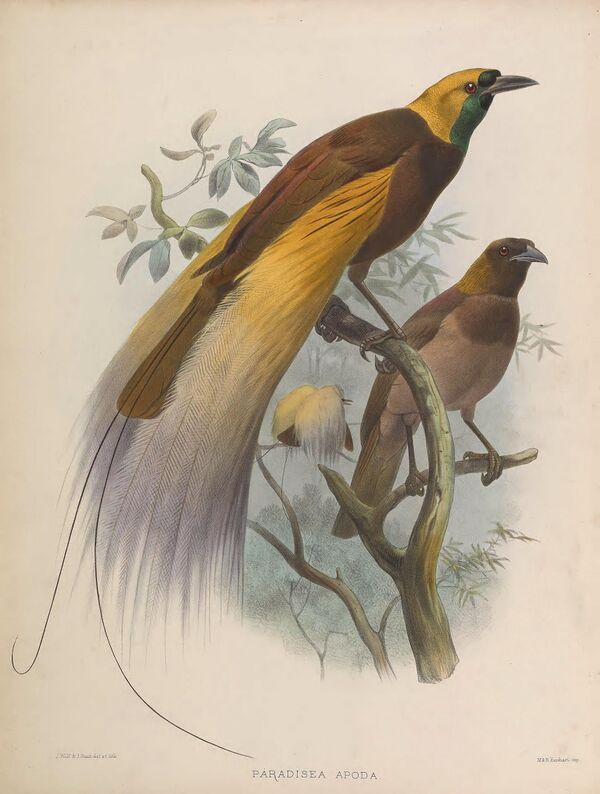 Чучела райских птиц покупались индийцами для украшения и в магических целях: считалось, что они приносят военную удачу и вообще расположение богов. Названия манукодията и т. п. возникли из туземного мануко девата — «птица божья», так как райские птицы чаще встречались летающими высоко в небе. Это обстоятельство послужило и для других названий: солнечные и небесные птицы. Вероятно, отсюда же идут и упоминания о райском происхождении этих птиц. Представления о длинной и страшной парадызеи вероятно также связаны с наблюдением чучел, так как засушенные аборигенами райские птицы выглядели большими и плоскими, потому что при сушке их клали, сжимая между двух досок, на солнце или «над великим жаром»[4][24].