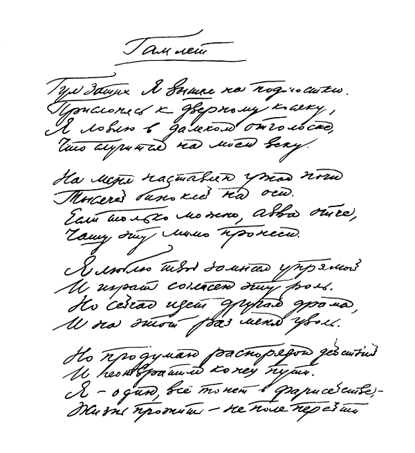В 1913 года году в письме к С. П. Боброву Б. Л. Пастернак рассуждает о городе как о сцене, на которой поэт встречается со стихией языка. Поэт в большом городе уподобляется актёру на сцене[8]. Таким образом, ещё в 1913 году у Б. Л. Пастернака сформировалась определённая комбинация образов и мотивов, которая пройдёт через всё его творчество и позже воплотится в «Гамлете». Судьба поэта — драматическое противостояние (как у актёра со зрительным залом), при этом город подобен сцене и создаёт условия для творчества. Есть высшее начало (Бог, предвечное Слово), которое наблюдает за поэтом-творцом. Кроме того, судьба поэта — жертвенный путь, соотносимый с путём Христа[1].