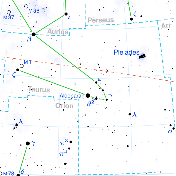 Гамма Тельца (γ Tau) — одиночная, двойная или оптически-двойная звезда[11] на острие "V"-образной структуры в созвездии Тельца. Является представителем скопления Гиады и находится в пределах 2,5 парсеков от центра скопления. Оценка расстояния, полученная на основе измерения годичного параллакса, составляет 154 световых года.