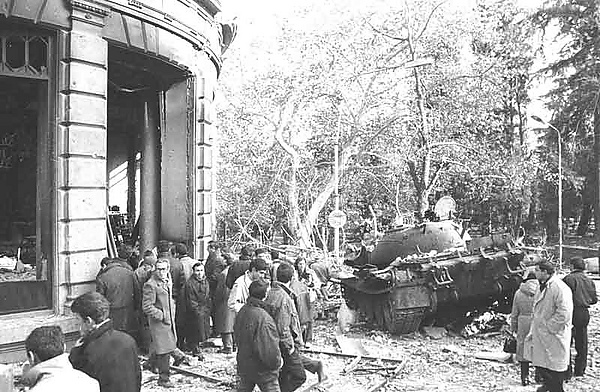 Две недели на проспекте Руставели шла настоящая война с использованием артиллерии и танков, в результате вооружённых столкновений в центре Тбилиси погибли несколько десятков человек, центр города был сильно разрушен[46]. 2 января 1992 года был создан Военный совет, объявивший о низложении Гамсахурдия, о введении чрезвычайного положения в Тбилиси с 3 января, временном приостановлении действия Конституции и роспуске парламента[47]. 6 января Гамсахурдия вместе со своими сторонниками покинул бункер Дома правительства, а затем и страну. Предусмотренная ст. 121. 7 действовавшей на тот момент Конституции Грузии 1978 года процедура импичмента не была проведена[48], хотя пришедший к власти Военный Совет объявил её недействительной, заявив о восстановлении действия Конституции Грузинской демократической республики 1921 года (юридическая сила которой была признана Актом о восстановлении государственной независимости Грузии от 9 апреля 1991 года)[49], в которой пост президента отсутствовал.