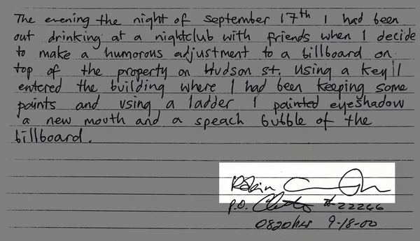 18 сентября 2000 года был задержан нью-йоркской полицией за порчу рекламного щита на крыше дома №675 на Хадсон-стрит. Приговорён к пяти дням общественных работ, заплатил штраф в размере 310 долларов[3]. Сохранился протокол, в котором художник признал свою вину. Поскольку он только начинал карьеру в стрит-арте и не успел прославиться, патрульные сочли его рядовым хулиганом.