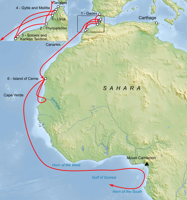 Сначала экспедиция во главе с Ганноном прошла вдоль северного побережья Африки, путешественники миновали Столбы Мелькарта (Гибралтарский пролив) и на значительное время остановились в городе Гадес (современный Кадис, Испания). Затем экспедиция отправилась на юго-запад. Во время путешествия Ганнон основал несколько колоний — в устье реки Себу (город Фимиатериум, ныне Мехдия), на мысу Солоент (ныне Кантен). После длительной остановки на мысу Солоент отправились дальше. Есть сведения только о названиях колоний — Карикон Тейхос (Карийская стена), Гитте, Акра, Мелитта, Арамбис, но достоверно определить их современное расположение невозможно. Известно, что карфагеняне останавливались на мысу Солоент, в Могадоре и Ликсусе. Высадившись на побережье Марокко, он основал колонию на месте современного Рабата и построил там храм. В общей сложности он заложил на берегу Марокко пять городов, включая Агадир. Как далеко на юг зашла его экспедиция — неясно: он наверняка достиг берегов Гамбии или Сьерра-Леоне и, возможно, даже видел вулкан Камерун. Его Ганнон назван «Феон Охема» — «Колесницы богов».