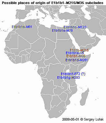 Вопрос о том, где возникла гаплогруппа E1b1b1, окончательно не решён (Восточная Африка или Средний Восток). Однако в настоящее время большинство исследователей склоняется в пользу Восточной Африки (возможно, район современной Северной Эфиопии). Относительно времени возникновения также нет единого мнения. Это связано с тем, что некоторые исследователи при определении возраста гаплогруппы используют так называемые эволюционные поправки Животовского, которые увеличивают первичный возраст примерно в 2-3 раза. Другие же исследователи не согласны с использованием этих поправок.