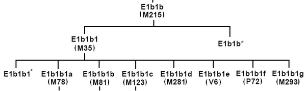 В свою очередь, E1b1b1 делится на субклады: Гаплогруппа E1b1b1* (M35), Гаплогруппа E1b1b1a (V68), Гаплогруппа E1b1b1b (Z827), Гаплогруппа E1b1b1c (V6), Гаплогруппа E1b1b1d (V92).