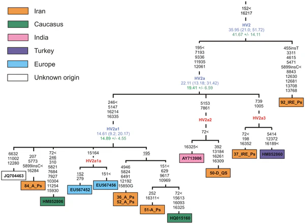 - I7173 — Gonur 2013 Area 22 shaft tomb N4236 N8m — Гонур-Депе, Туркменистан — 2500–1700 BCE — HV2a.[1]