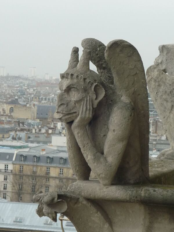 Популярность «гаргулий» не может быть объяснена лишь интересом к формам готического искусства в собственном смысле. Появление в силуэте Парижа демонических тварей, посматривающих с высоты на человеческие дела — во Франции в это время происходили революции, менялись режимы, торжествовали то гражданская свобода, то реакция (нередко эти потрясения отражались на субсидировании реставрации), — задавало своего рода камертон для осмысления современниками реалий повседневности. Поскольку с точки зрения католического катехизиса профили химер над крышами мегаполиса необъяснимы, их трактовки культурой не были стеснены традицией и могли уходить довольно далеко от христианской проблематики. Тиражируемые средствами эстампа и фотографии, эти образы были хорошо узнаваемы публикой — в первую очередь, конечно, знаменитый «Мыслитель» — и были по-настоящему в моде. В образах чудовищ собора Богоматери кристаллизировались как современные фобии[53] (например, социальных потрясений), так и широко обсуждаемые проблемы эволюционной науки (человек в сопоставлении или противопоставлении прочим тварям), актуальность их поддерживалась употреблением в политическом контексте как карикатурных персонификаций партий и лидеров, наконец, полуантропоморфные химеры оказались выразительной метафорой любого явления на границе человеческого и животного, будь то звериные инстинкты революционной толпы[54], неприглядные задворки блестящей столичной цивилизации промышленного века или скрываемые уголки индивидуальной психики — все эти темы как раз тогда стали предметом пристального интереса культуры.