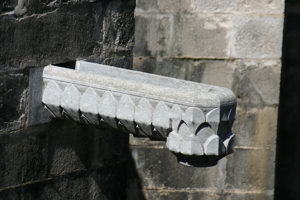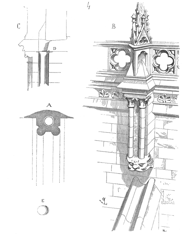 Несмотря на то, что в отдельных случаях система сбора осадков в составе готической конструкции весьма совершенна и может включать несколько последовательно задействованных элементов (например, канавки и промежуточные гаргуйли, каскадно сбрасывающие воду на поперечные желоба по верху аркбутанов[26]), она, в отсутствие решения вертикального спуска воды к отмостке, остаётся полуорганизованным водоотводом. Штукатурные фасады, особенно чувствительные к намоканию, не могут быть в достаточной степени защищены этой системой. Принято считать, что в 1240 г., когда донжон лондонского Тауэра был побелён, на нём были впервые установлены свинцовые водосточные трубы[27]. В эпоху Возрождения, когда торжество античной эстетики привело в архитектуре к почти повсеместному упадку или значительной трансформации национальных строительных традиций и школ, прежняя продуманная система отвода дождевых вод деградировала: теперь свес кровли, поддержанный антаблементом с сильно выступающим карнизом, больше не угрожал стенам сыростью, вода стекала за счёт устройства слезника (сплошная канавка вдоль обращённой вниз поверхности карниза, препятствующая капиллярному току воды в направлении стены) или выступа кровельного материала (черепицы, шифера, железа). Вместе с водосточным жёлобом по обводу крыши исчезает и гаргуйль. Когда в конце XVII в. возвращается водосточный жёлоб[28], он чаще всего уже элемент кровли (технологически и эстетически), а не стены, и связан с организованным вертикальным водоотводом (водосточная труба).