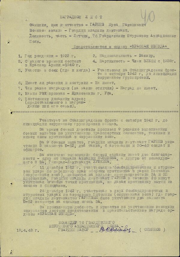 - «Над полем боя проявляет храбрость и мужество...» Жизнь легендарного летчика Мусы Гареева