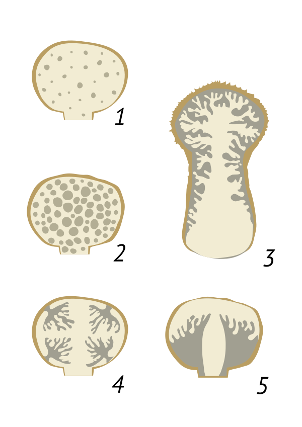 - Равномерный — базидии расположены равномерно в слое трамы, гимениальный слой отсутствует (это характерно для родов Tulostoma, Battarrea)