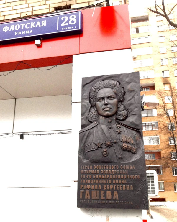 Мемориальная доска лётчице Руфине Гашевой установлена в 2018 году в Москве, на доме 28, корпус 1 по Флотской улице.
