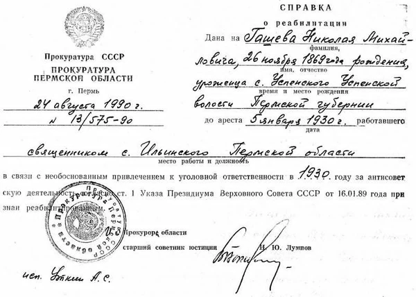 «Я, Гашев Николай Михайлович, привлекаюсь в качестве обвиняемого, показываю следующее: по поводу предъявленных мне обвинений в антисоветской агитации заявляю, что я, как и всякий гражданин, отношусь к Советской власти лояльно, но не отрицаю, что как священнослужитель должен был ревностно защищать веру Христову и показывать пример в этом своим прихожанам. Поэтому я действительно в церкви призывал прихожан укреплять веру Божию, молиться чаще, указывая на пример первых христиан, страдавших и подвергавшихся гонениям за свою великую преданность вере. Каких-либо высказываний против Советской власти в проповедях не допускал, церковную службу проводил по уставу, избегал вообще каких-либо конфликтов с властями, поэтому виновным себя в агитации против советской власти не признаю. Никаких бесед против советской власти не проводил и не устраивал никаких нелегальных собраний».