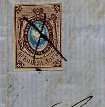 - гашение надписью (в форме пометок почтового служащего)[13]: город, в котором, очевидно, было отправлено почтовое отправление[14], или, возможно, «инициалы местного почтмейстера»[6].