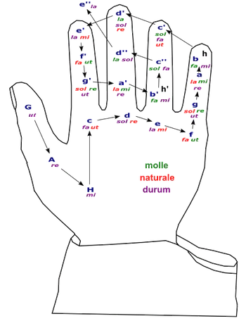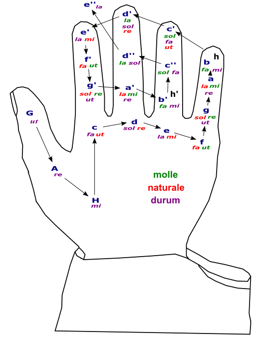 Красным цветом обозначены воксы (слоговые маркеры) натурального гексахорда (natura), фиолетовым — твёрдого (durum), зелёным — мягкого (molle). Клависы (буквенные обозначения высот) обозначены синим цветом. Локус C-fa-ut расположен на нижнем суставе указательного пальца[1].
