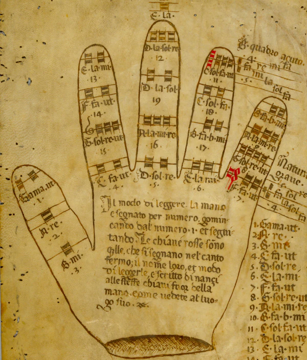 Каждая из ступеней звукоряда в гексахордовой системе Гвидо, маркируемая как сочетание буквенного «клависа» (например, C) и слоговых «воксов» (например, fa-ut), представляется расположенной на суставе или конце пальца левой руки («локус» C-fa-ut). Местоположения (локусы) ступеней восходящего звукоряда располагаются по спирали против часовой стрелки: