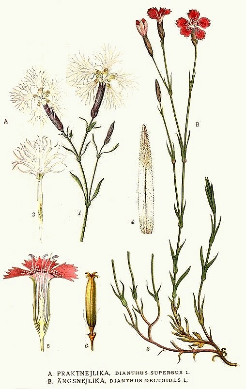 Слева направо — Цветок гвоздики пышной и её подвидов: Dianthus superbus subsp. longicalycinus, Dianthus superbus subsp. alpestris, Dianthus superbus var. speciosus; плоды и семена