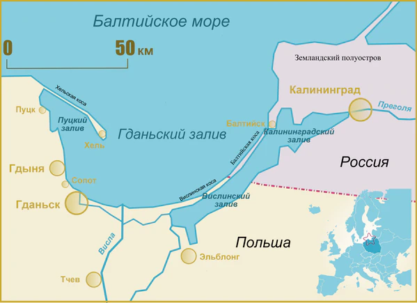 На берегу Гданьского залива расположены крупные города-порты Гдыня, Гданьск, Балтийск (главная база Балтийского флота России), посёлок Янтарный.