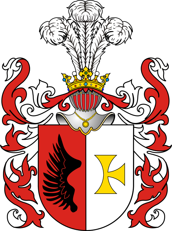 Щит рассечён на червлень и серебро. В червлене чёрное орлиное крыло, в серебре золотой кавалерский крест без правого конца. В нашлемнике три страусовых пера.