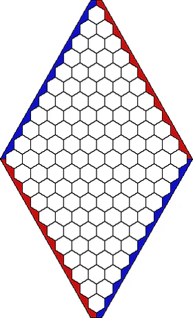 - Две противоположные стороны доски окрашены в красный и синий цвета, и называются соответственно красной и синей сторонами. Поля на углах доски относятся к обеим сторонам. Для того чтобы выиграть, игрок должен выстроить цепь из своих фишек, соединив ею стороны своего цвета, то есть красные стремятся построить цепь из красных фишек между двумя красными сторонами доски, а синие — цепь из синих фишек между синими сторонами.