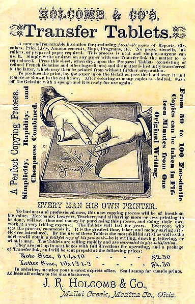 Для желатиновой печати обычно используются плоские гектографы, представляющие собой ящик, заполненный смесью, приготовленной из одной части желатина, четырёх частей глицерина и двух частей воды. Масса застывает в жестяных ящиках. Рукопись, написанную анилиновыми чернилами, плотно прикладывают к массе и через несколько минут на гектографе получается оттиск, который копируется на прикладываемых листах бумаги.