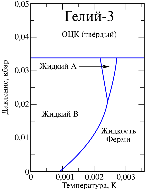 Квантовая жидкость, существенно отличающаяся по свойствам от жидкого гелия-4. Жидкий гелий-3 удалось получить только в 1948 году. В 1972 году в жидком гелии-3 был обнаружен фазовый переход в сверхтекучее состояние при температурах ниже 2,6 мК и при давлении 34 атм (ранее считалось, что сверхтекучесть, как и сверхпроводимость — явления, характерные для бозе-конденсата, то есть кооперативные явления в среде с целочисленным спином объектов). За открытие сверхтекучести гелия-3 в 1996 году Д. Ошерову, Р. Ричардсону и Д. Ли была присуждена Нобелевская премия по физике.