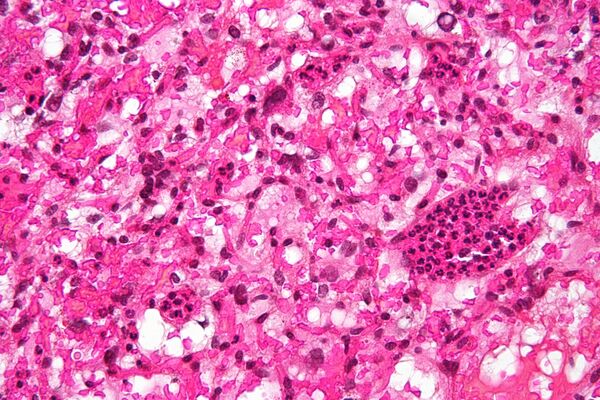 Микроскопически гемангиобластомы представляют собой скопления тонкостенных сосудов различного размера. В межсосудистых пространствах располагаются интерстициальные клетки с богатой липидами светлой цитоплазмой[18].