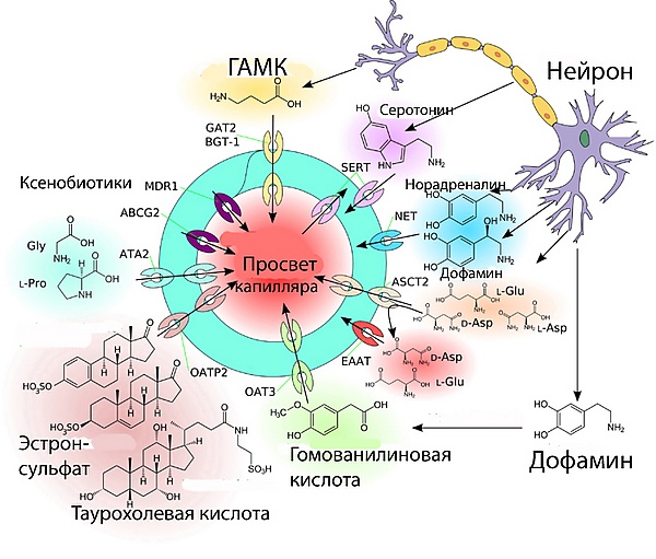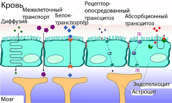Особой формой диффузии через клеточную мембрану является облегчённая диффузия. Целый ряд необходимых для мозга веществ, как например, глюкоза и многие аминокислоты, полярны и слишком велики для непосредственной диффузии через клеточную мембрану. Для них на поверхности клеточных мембран эндотелиоцитов располагаются специальные транспортные системы. Например, для глюкозы и аскорбиновой кислоты (витамина С)[139] это GLUT-1-транспортёр. Их количество на поверхности обращённой в полость сосуда в 4 раза больше, чем на обращённой к мозгу.