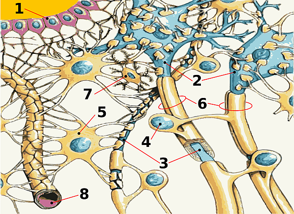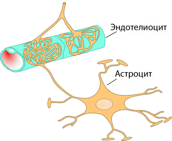 Пластинчатые окончания отростков астроцитов неплотно покрывают со стороны мозга базальную мембрану сосудистой стенки с расположенными на ней эндотелиоцитами и перицитами. За счёт этого между эндотелиоцитами и тканью мозга возможна прямая диффузия различных веществ[78].