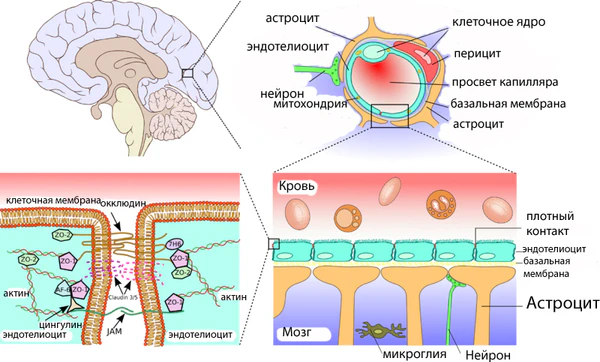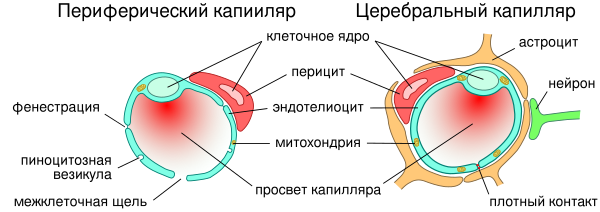 Капиллярные сосуды выстланы эндотелиальными клетками. Эндотелий сосудов большинства тканей содержит открытые промежутки (фенестра́ции) диаметром около 50 нм и межклеточные щели от 100 до 1000 нм. Через эти промежутки вода и растворённые в ней вещества циркулируют между кровью и межклеточным пространством. Отличительной особенностью сосудов центральной нервной системы является отсутствие как фенестраций, так и межклеточных щелей между эндотелиальными клетками[30]. Таким образом, эндотелиальная выстилка капилляров мозга является сплошной[31].