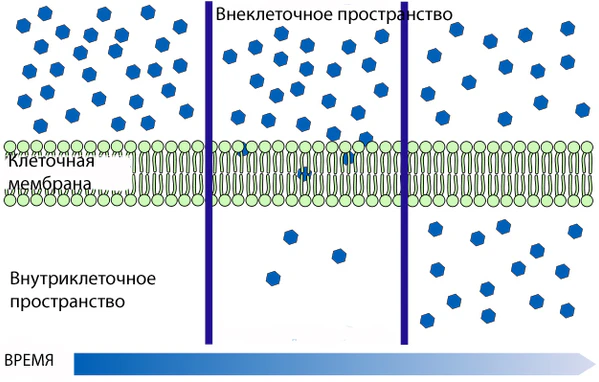 Транспортёры могут осуществлять перенос веществ в одном либо двух направлениях[141]. В отличие от активного транспорта облегчённая диффузия направлена в сторону пространства (внутри- или внеклеточного) с меньшей концентрацией вещества и не требует затрат клеточной энергии.