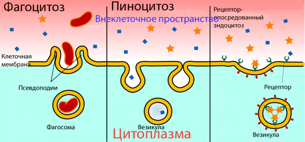 С помощью рецептор-опосредованного трансцито́за происходит перенос больших молекул. На обращённой в просвет сосуда поверхности клетки расположены специальные рецепторы для опознавания и связывания определённых веществ[23]. После контакта рецептора с веществом-мишенью происходит их связывание, участок мембраны инвагинируется в полость клетки и образуется внутриклеточный пузырёк — везикула. Затем она перемещается к обращённой к нервной ткани поверхности эндотелиальной клетки, сливается с ней и высвобождает связанные вещества. Таким образом во внеклеточное пространство мозга переносятся состоящий из 679 аминокислот белок трансферрин массой 75,2 кДа[162], липопротеины низкой плотности из которых образуется холестерин[130][163], инсулин[164] и другие пептидные гормоны[23].