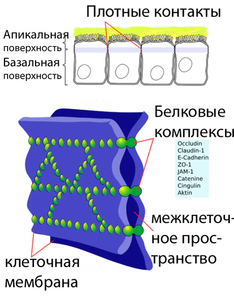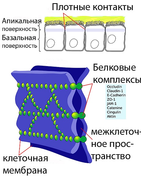 Эндотелиальные клетки сосудов мозга плотно прилегают друг к другу. Между их стенками образуются так называемые плотные контакты, роль которых в обеспечении ГЭБ состоит в том, что они предотвращают проникновение в ткань мозга различных нежелательных веществ из кровеносного русла[45][46]. Плотные контакты между эндотелиальными клетками блокируют межклеточный (парацеллюля́рный) пассивный транспорт[47][48][49]. При этом блокируется парацеллюлярный транспорт веществ как из кровеносного русла в ткань мозга, так и в обратном направлении — из мозга в кровь[29].