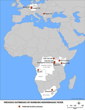 Хотя природные очаги распространения вируса находятся в Африке, впервые болезнь наблюдалась в 1967 году в Европе: в городах Марбурге и Франкфурте-на-Майне, также один человек наблюдался в Белграде. Источником инфекции в дальнейшем были признаны ввезённые из Уганды в Марбург компанией «Берингверке» (компания была основана первым лауреатом Нобелевской премии в области физиологии и медицины Эмилем фон Берингом) африканские зелёные мартышки Cercopithecus aethiops sabaeus (отсюда одно из названий заболевания), ткани которых использовались для создания полиомиелитной вакцины. Был зарегистрирован 31 случай заболевания (25 заражённых непосредственно от обезьян и 6 уже от них[4]) и 7 смертельных исходов. В дальнейшем подобные заболевания наблюдались в Кении, Уганде, Демократической Республике Конго, Анголе, ЮАР, Гвинее и Гане[5][6].