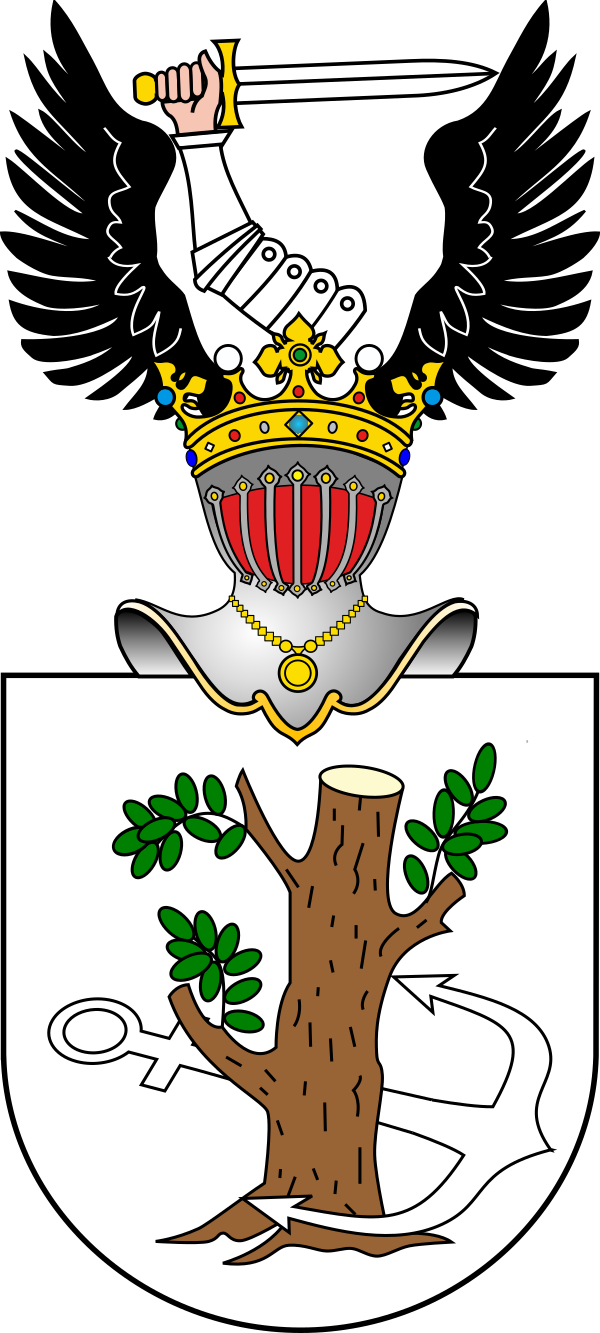 В серебряном поле пень с тремя зеленеющими ветвями, обхваченный снизу якорем, который обращен анкерштоком к правому верхнему углу щита.