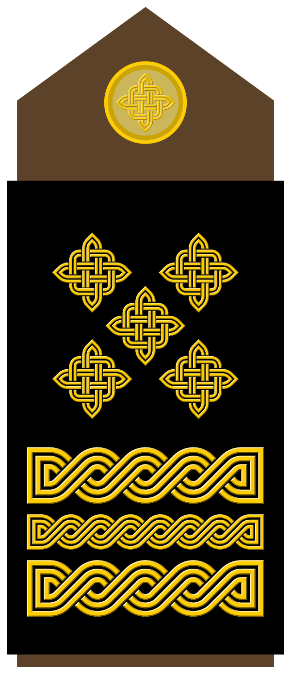Знаки различия выглядят следующим образом: над тремя горизонтальными удлиненными косами (средняя из которых тоньше) расположены пять звёздочек[4].