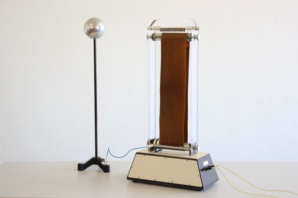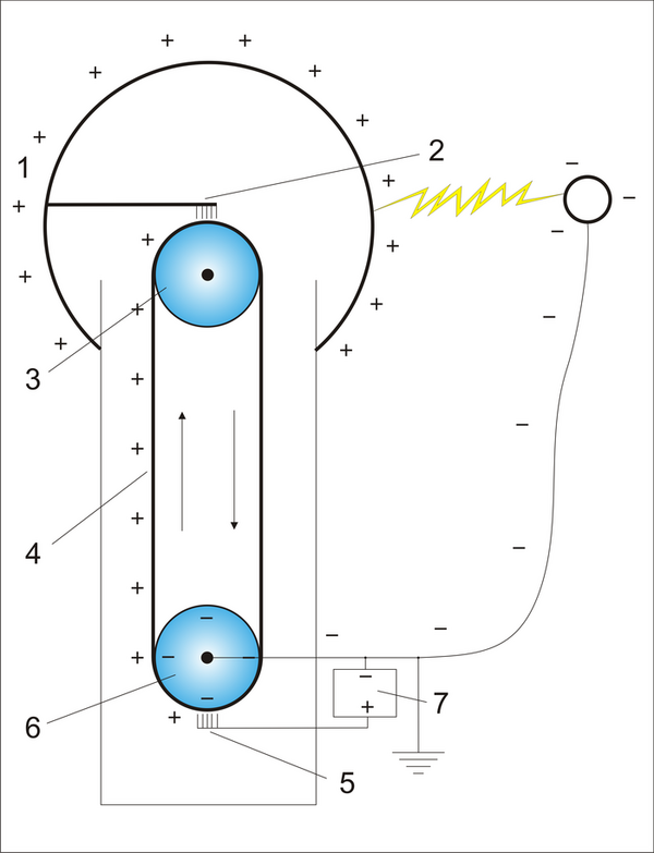 Простой генератор Ван де Граафа состоит из диэлектрической (шёлковой или резиновой) ленты (4 на рисунке «Схема генератора»), вращающейся на роликах 3 и 6, причём верхний ролик диэлектрический, а нижний металлический; он соединён с землёй. Один из концов ленты заключён в металлическую сферу 1. Два электрода 2 и 5 в форме щёток находятся на небольшом расстоянии от ленты сверху и снизу, причём электрод 2 соединён с внутренней поверхностью сферы 1. Через щётку 5 воздух ионизируется от источника высокого напряжения 7, образующиеся положительные ионы под действием силы Кулона движутся к заземлённому ролику 6 и оседают на ленте; движущаяся лента переносит заряд внутрь сферы 1, где он снимается щёткой 2; под действием силы Кулона заряды выталкиваются на поверхность сферы, и поле внутри сферы создаётся только дополнительным зарядом на ленте. Таким образом, на внешней поверхности сферы накапливается электрический заряд. Возможность получения высокого напряжения ограничена коронным разрядом, возникающим при ионизации воздуха вокруг сферы.