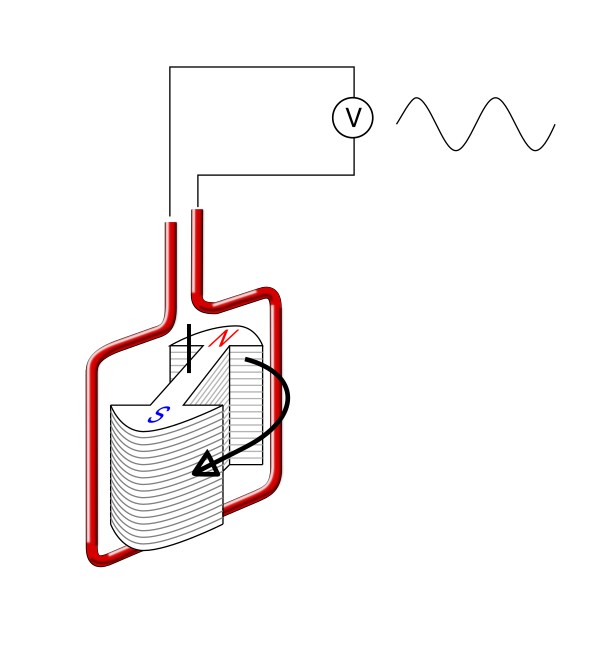Принцип работы генератора заключается в преобразовании механической энергии в электрическую путем вращения проволочной катушки в магнитном поле. Электрический ток вырабатывается и тогда, когда силовые линии движущегося магнита пересекают витки проволочной катушки. Электроны перемещаются по направлению к положительному полюсу магнита, а электрический ток течет от положительного полюса к отрицательному. До тех пор, пока силовые линии магнитного поля пересекают катушку (проводник), в проводнике индуцируется электрический ток. Аналогичный принцип работает и при перемещении проволочной рамки относительно магнита, то есть когда рамка пересекает силовые линии магнитного поля. Индуцированный электрический ток течет таким образом, что его поле отталкивает магнит, когда рамка приближается к нему, и притягивает, когда рамка удаляется. Каждый раз, когда рамка изменяет ориентацию относительно полюсов магнита, электрический ток также изменяет свое направление на противоположное. Все то время, пока источник механической энергии вращает проводник (или магнитное поле), генератор будет вырабатывать переменный электрический ток.