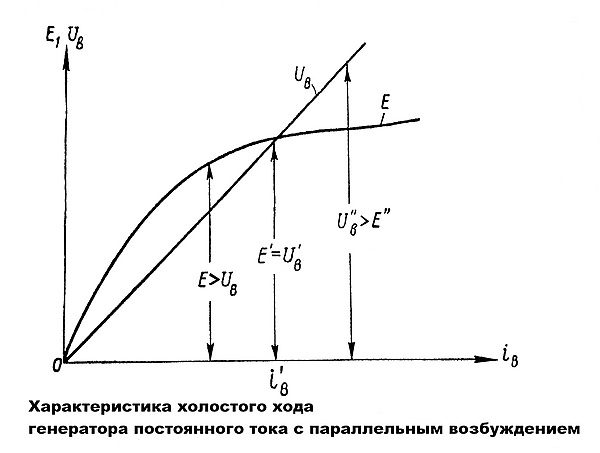 На рисунке приведена характеристика холостого хода генератора с параллельным возбуждением, то есть кривая зависимости напряжения на зажимах от тока возбуждения при постоянном числе оборотов якоря и при постоянном сопротивлении цепи возбуждения .